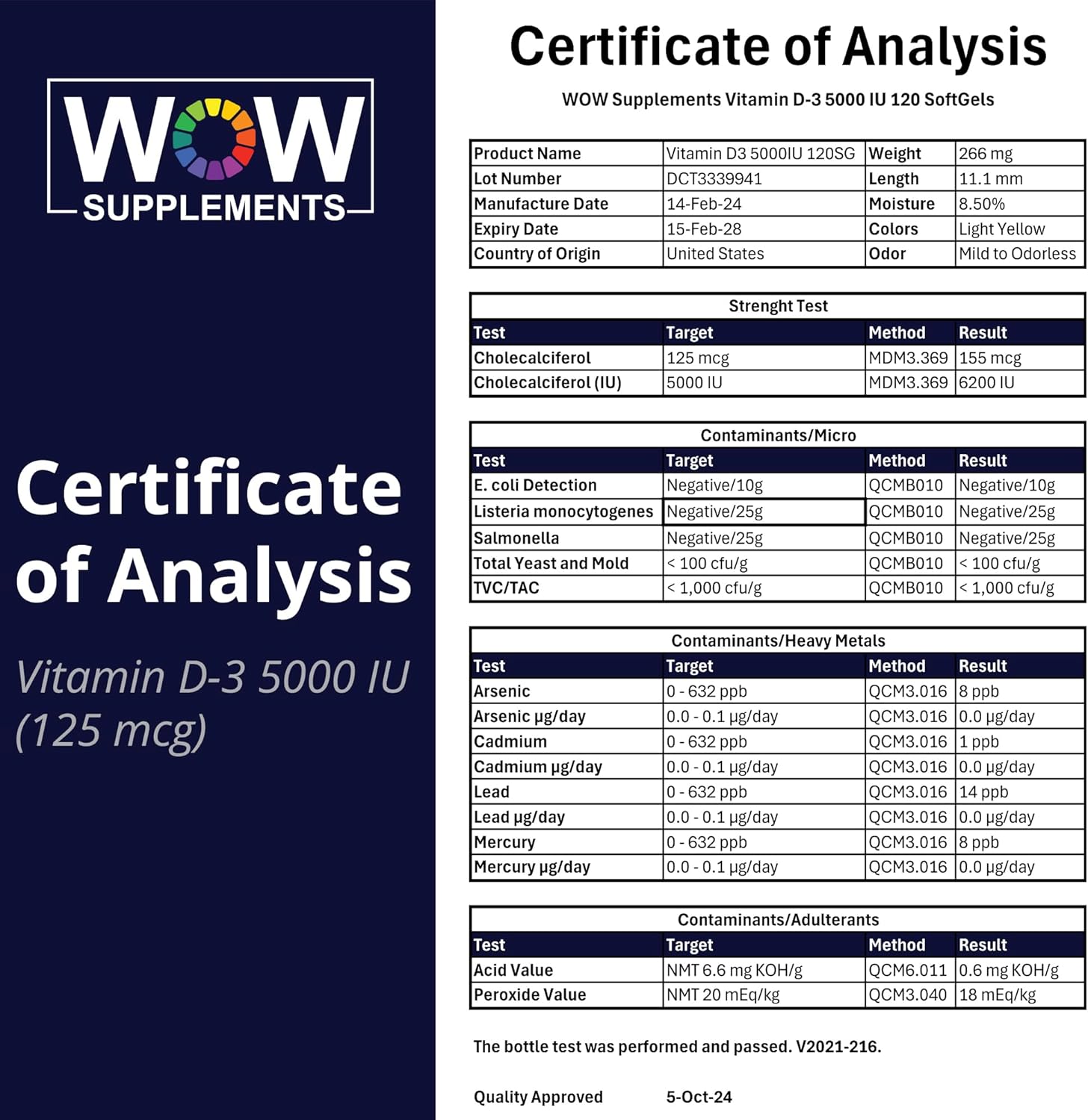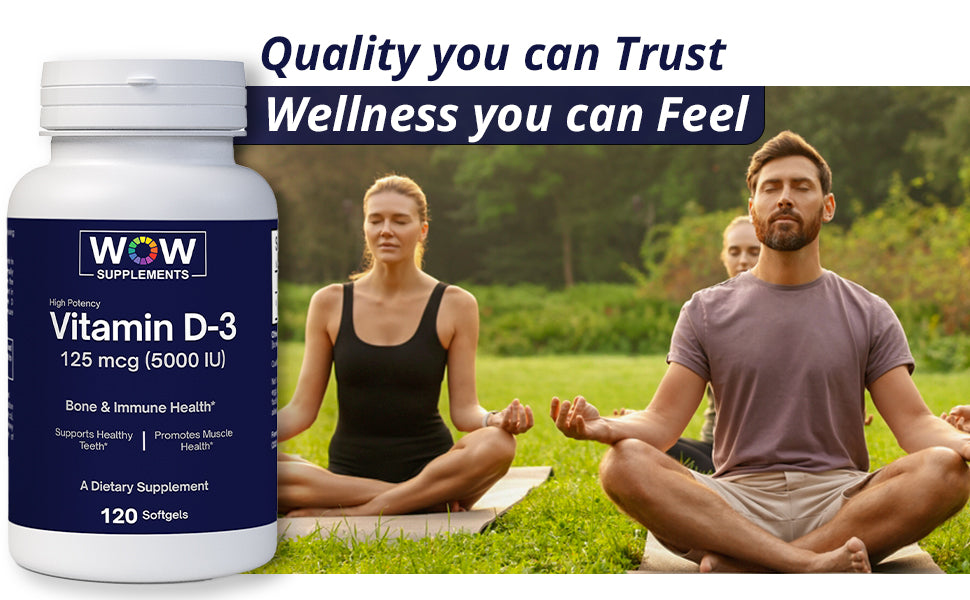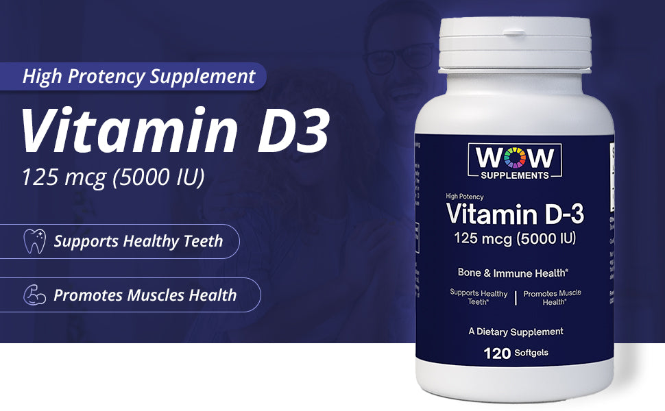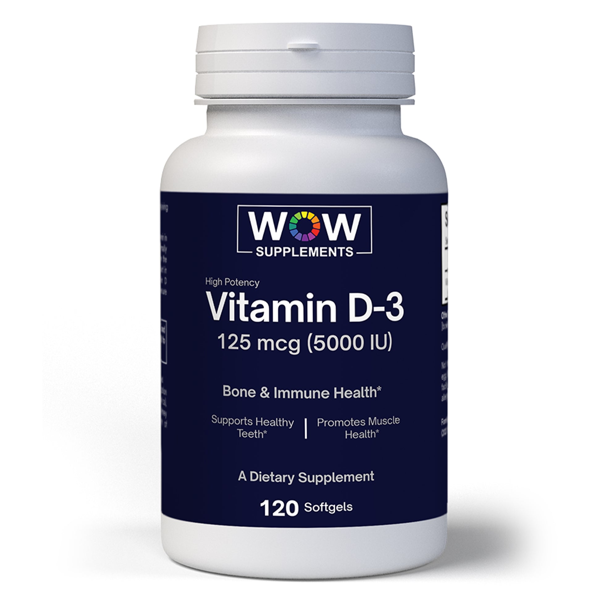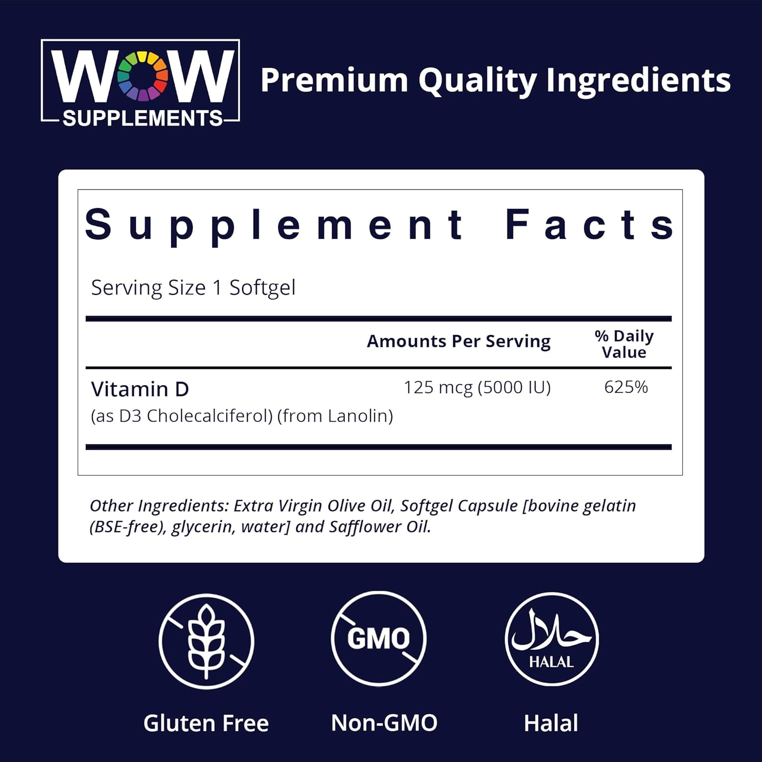 Vitamin D3 5000 IU (125mcg) Softgels – Bone & Immune Support - 120 Count | WOW Supplements